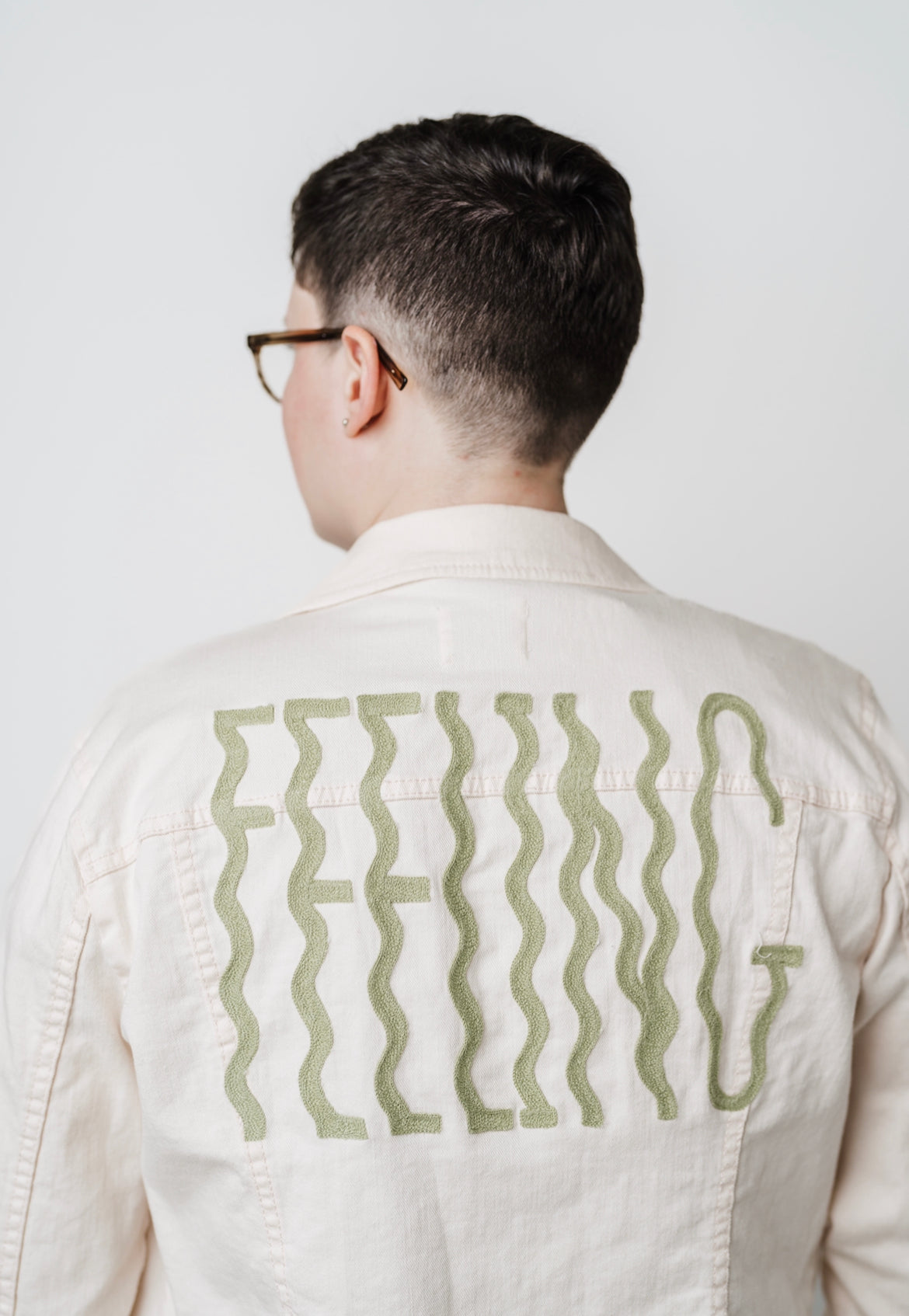 I created the "feeling" lettering design after a rough week of back and forth and up and down emotions. Often times my feelings are unpredictable and fluid. Maybe this jacket can be a reminder that fluctuating feelings are normal and 100% human. Chainstitch embroidery is hand cranked by yours truly on my Consew 104-1T.