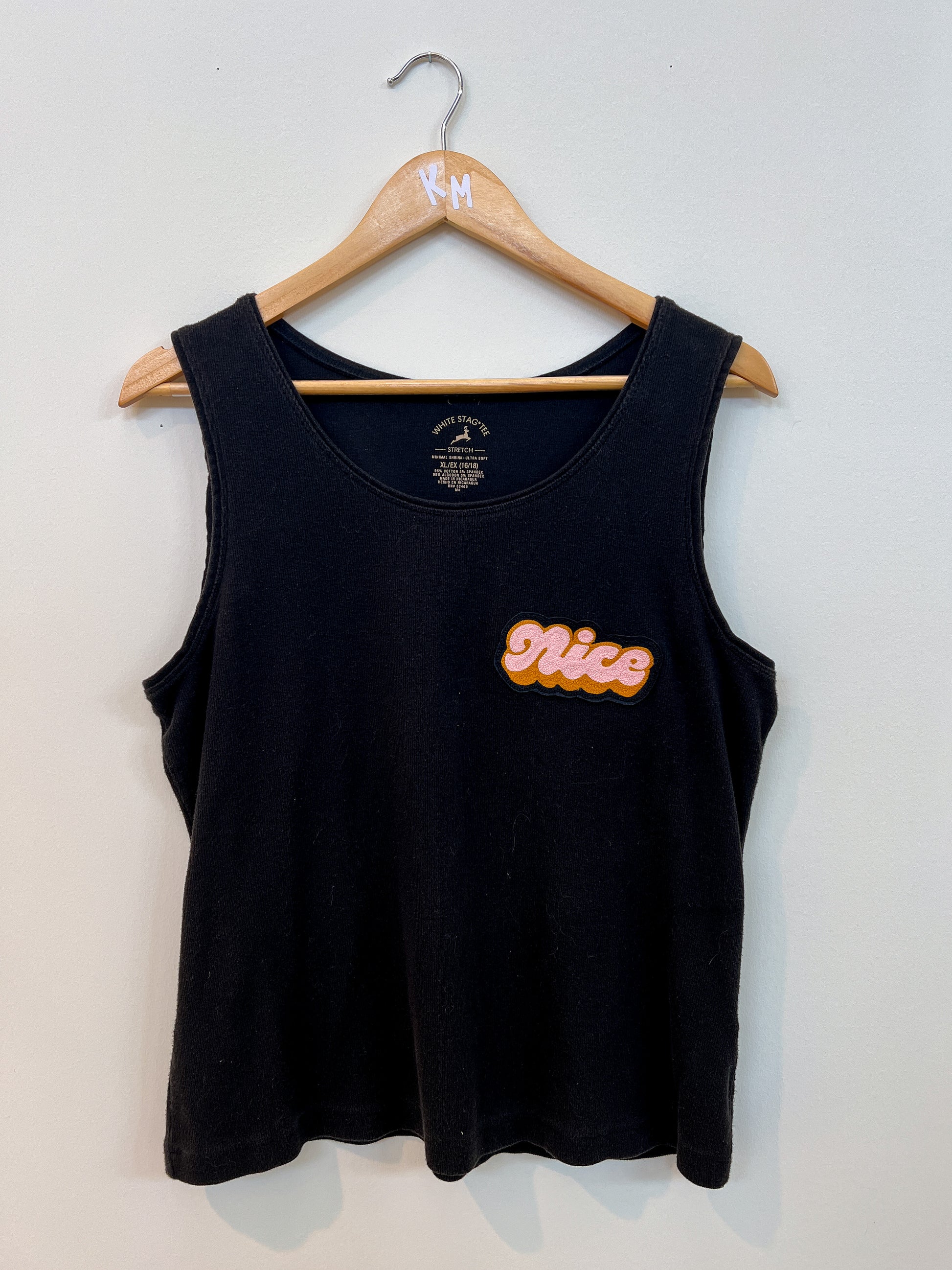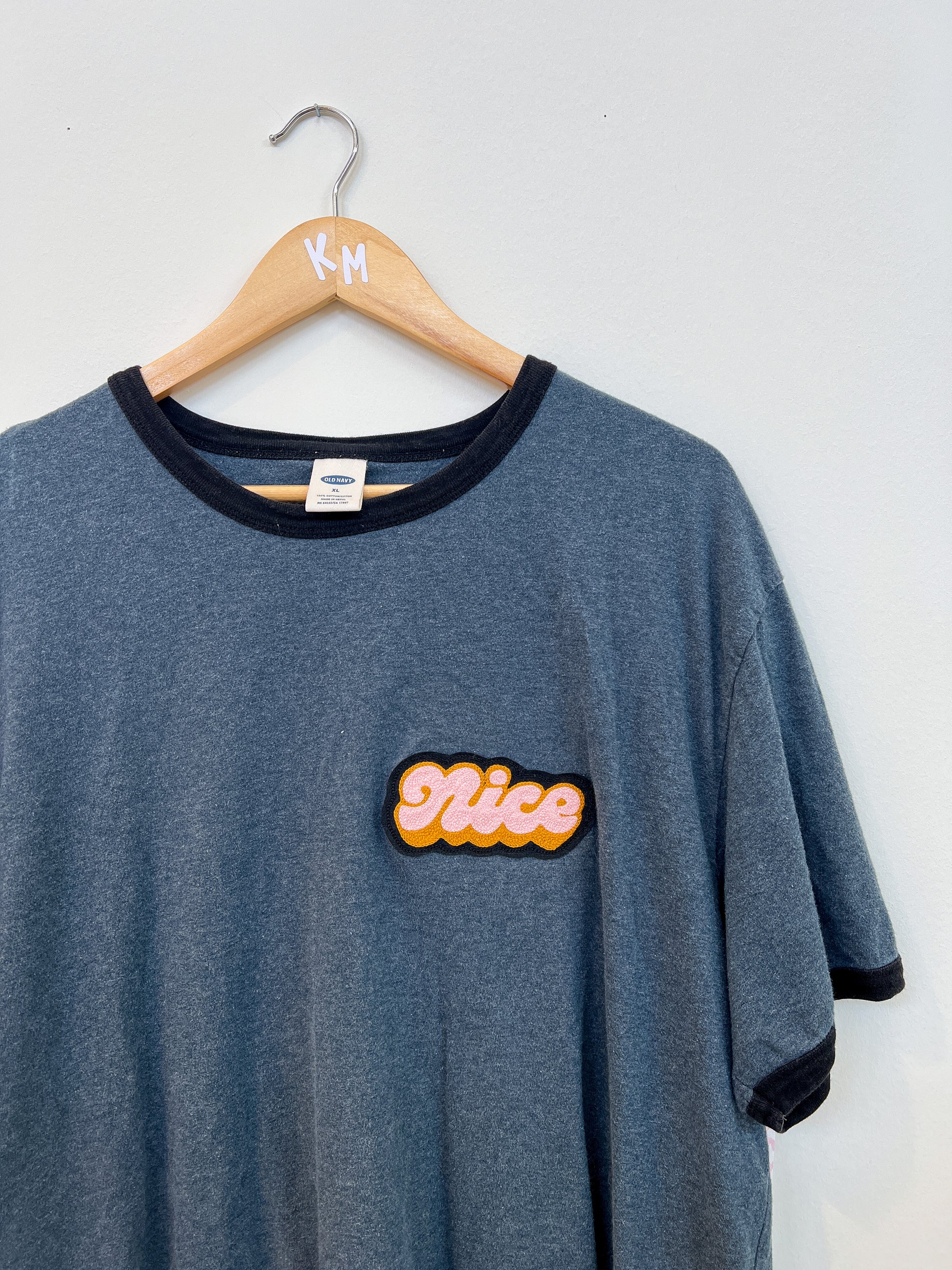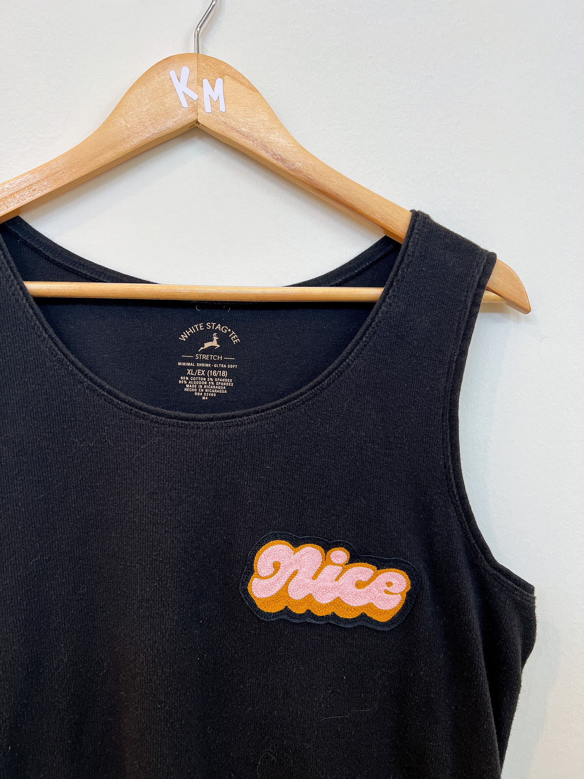 Ringer tee and tank are thrift-store rescues with hand-cranked chainstitch embroidery patches added, created in collaboration with Lisa Taniguchi, a Lettering Artist & Muralist from Vancouver, Canada! Sizing/color included in the variant, option to purchase just the Nice patch to sew onto your own garment!