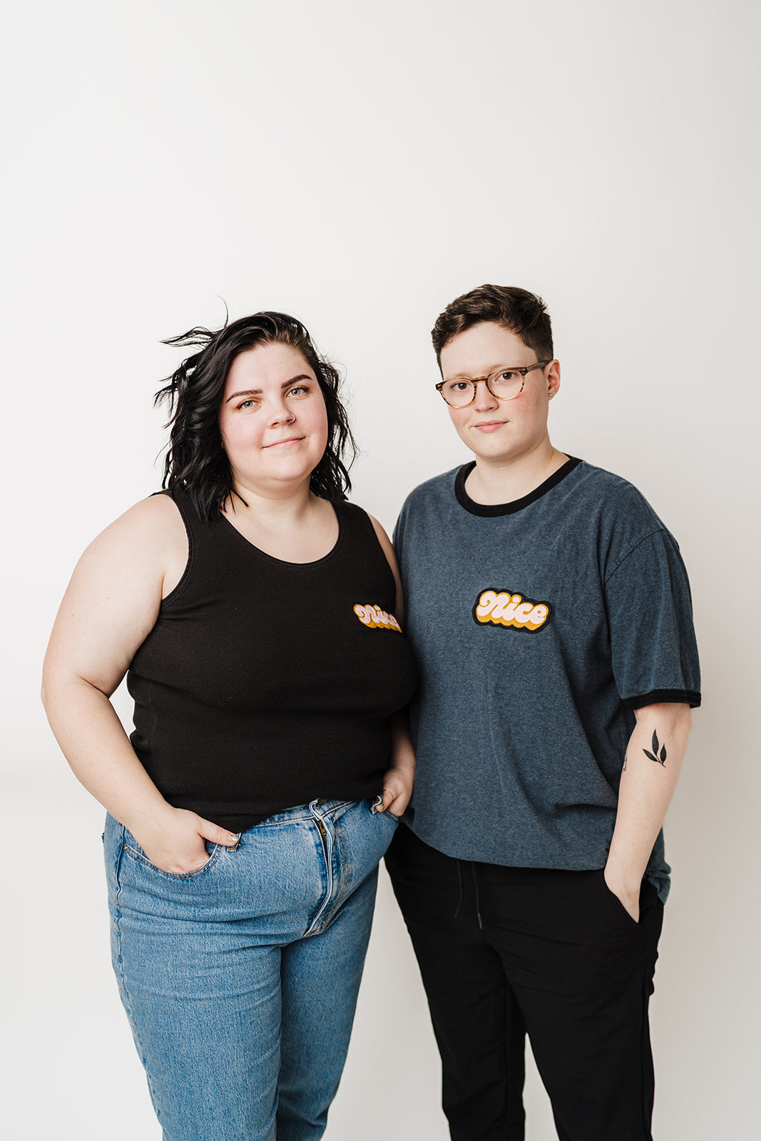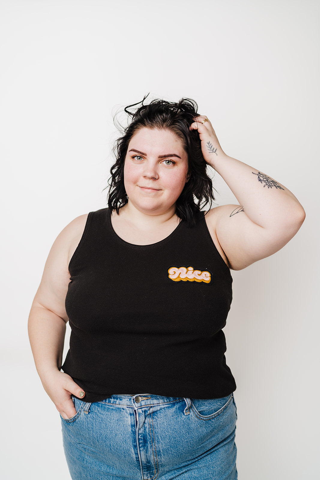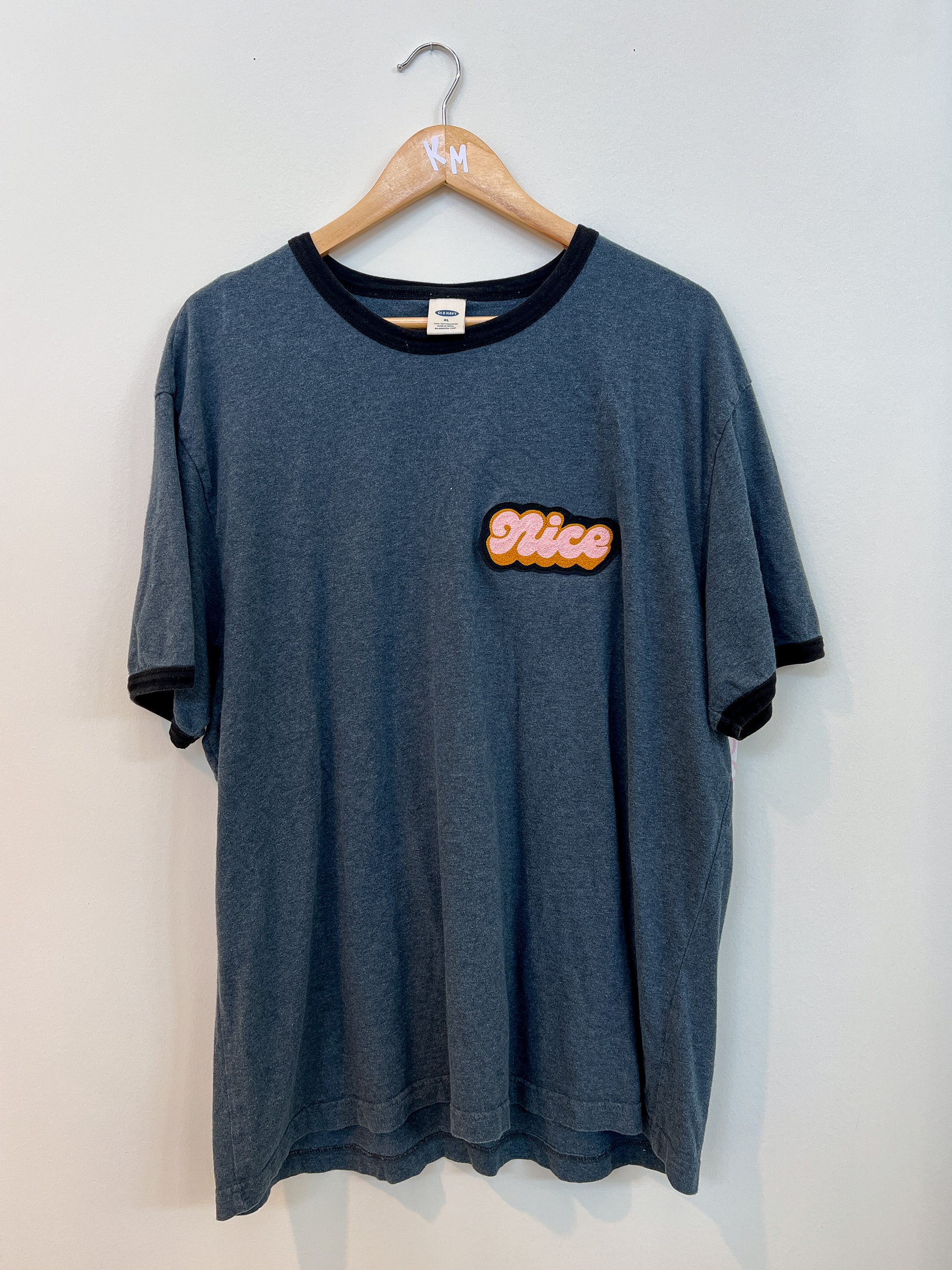 Ringer tee and tank are thrift-store rescues with hand-cranked chainstitch embroidery patches added, created in collaboration with Lisa Taniguchi, a Lettering Artist & Muralist from Vancouver, Canada! Sizing/color included in the variant, option to purchase just the Nice patch to sew onto your own garment!